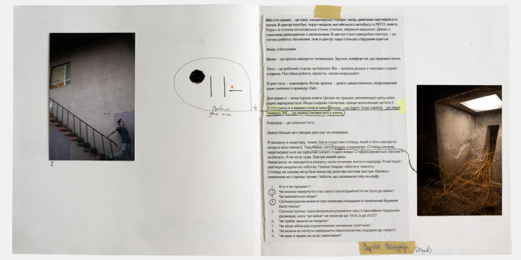 In 2023, I made multiple trips to Ukraine. I asked about 50 strangers in Ukraine to share their personal photos with me. I talked to people on the streets, in a rehabilitation hospital, at school, in a psychiatric ward, in bars and clubs, at a combat medic training center, at a university, and other public places. I asked them to respond to my questions about their war experiences with a photo from their mobile phones taken in 2023. I always carried a mini printer with me to instantly print their pictures.